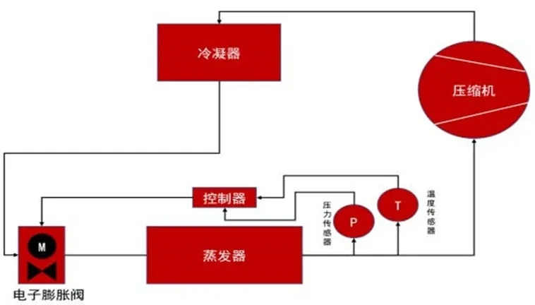 電子膨脹閥采用“傳感器+電機(jī)+控制器”的電氣傳動(dòng)方案,通過(guò)實(shí)時(shí)監(jiān)測(cè)并調(diào)整蒸發(fā)器出口的壓力與過(guò)熱度,實(shí)現(xiàn)制冷劑流量的精確控制。