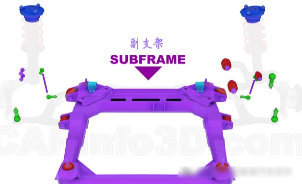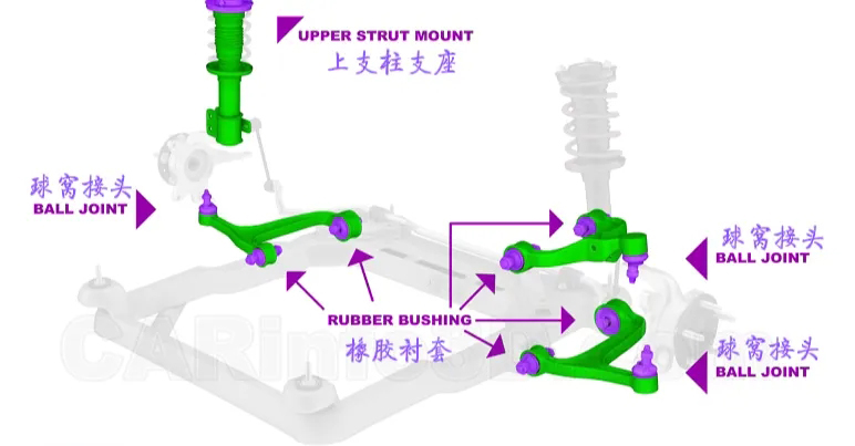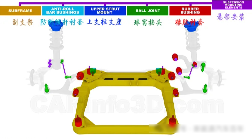 懸架安裝用到的部件有:橡膠襯套、球窩接頭、上支柱支座、防側(cè)傾桿襯套和副支架。