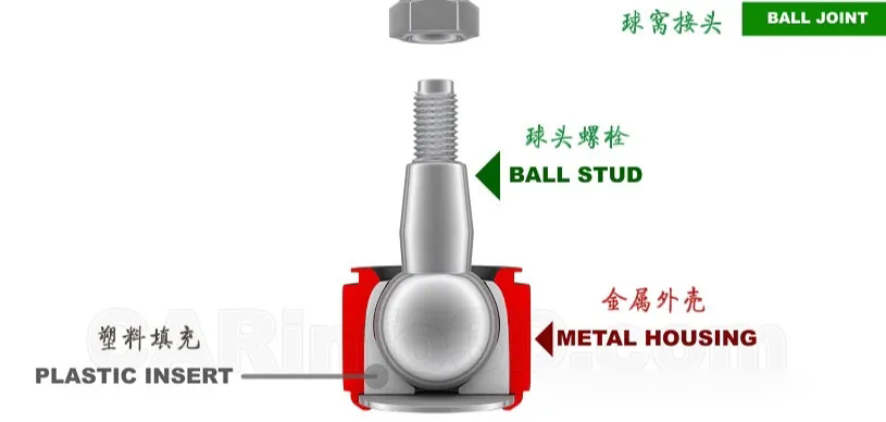 球窩接頭的中間是一個(gè)球釘,外面由金屬外殼包裹,內(nèi)部則由塑料填充,球釘可以擺動(dòng)和旋轉(zhuǎn)。