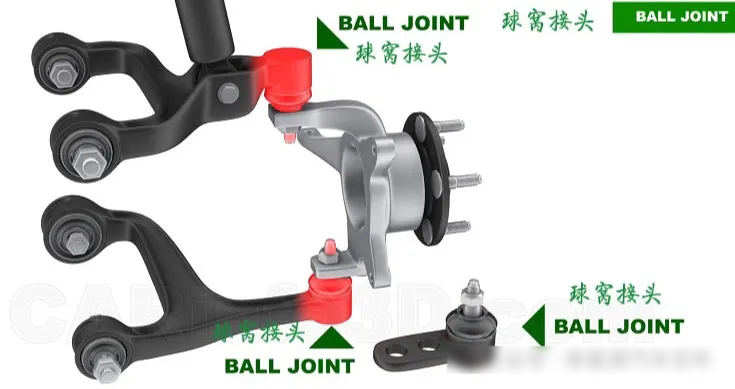 控制臂與轉(zhuǎn)向節(jié)的連接用的就是球窩接頭,球窩接頭可以是獨(dú)立的部件,也可以與控制臂集成為一體。