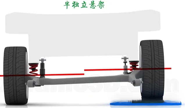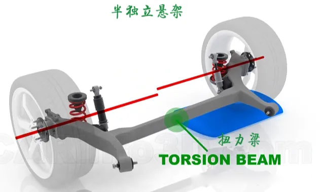 在半獨(dú)立懸架系統(tǒng)中,傳遞力的部件則主要是扭力梁。