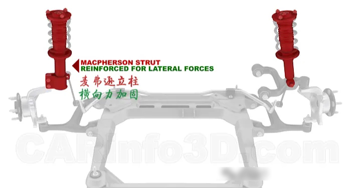 在懸架系統(tǒng)中,減震器也起到支撐和控制臂的作用,當(dāng)然,其底部會(huì)受到橫向加強(qiáng)。