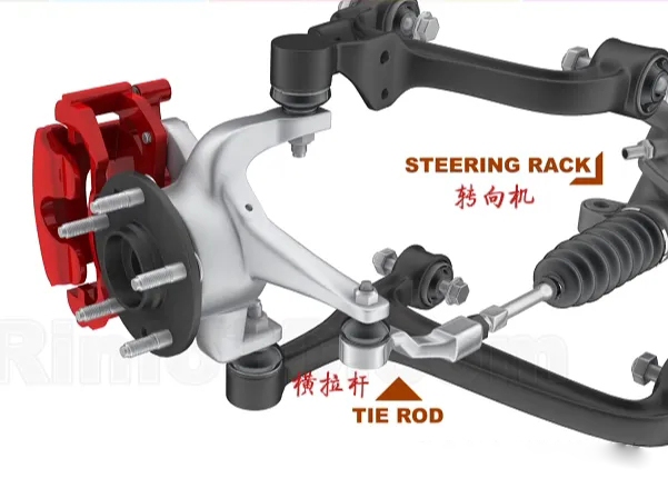轉(zhuǎn)向節(jié)除與控制臂連接,還與橫拉桿相連,此外,制動(dòng)鉗(紅色)也是安裝在轉(zhuǎn)向節(jié)上的。