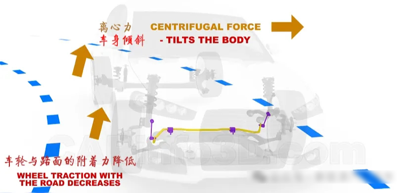 當(dāng)車輛轉(zhuǎn)彎時(shí),在離心力的作用下,汽車內(nèi)側(cè)的輪胎會(huì)有抬起來的趨勢(shì),從而降低其與地面的附著力,使車輛穩(wěn)定性降低。