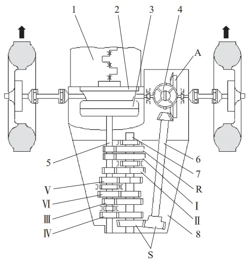 1—發動機;2—從動盤;3—離合器模塊;4—差速器;5—驅動軸(主軸);6—帶邊軸的主動齒輪;7—從動軸;8—手動變速器;Ⅰ—第1擋;Ⅱ—第2擋;Ⅲ—第3擋;Ⅳ—第4擋;Ⅴ—第5擋;Ⅵ—第6擋;R—倒車擋;A—主減速器;S—中間傳動的圓柱齒輪