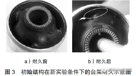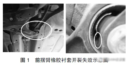某型號(hào)汽車的控制臂橡膠襯套在通過(guò)靜態(tài)、動(dòng)態(tài)剛度及臺(tái)架耐久測(cè)試后,于整車強(qiáng)化路試階段,行駛約5000公里時(shí),兩件襯套均出現(xiàn)開(kāi)裂現(xiàn)象,導(dǎo)致失效。