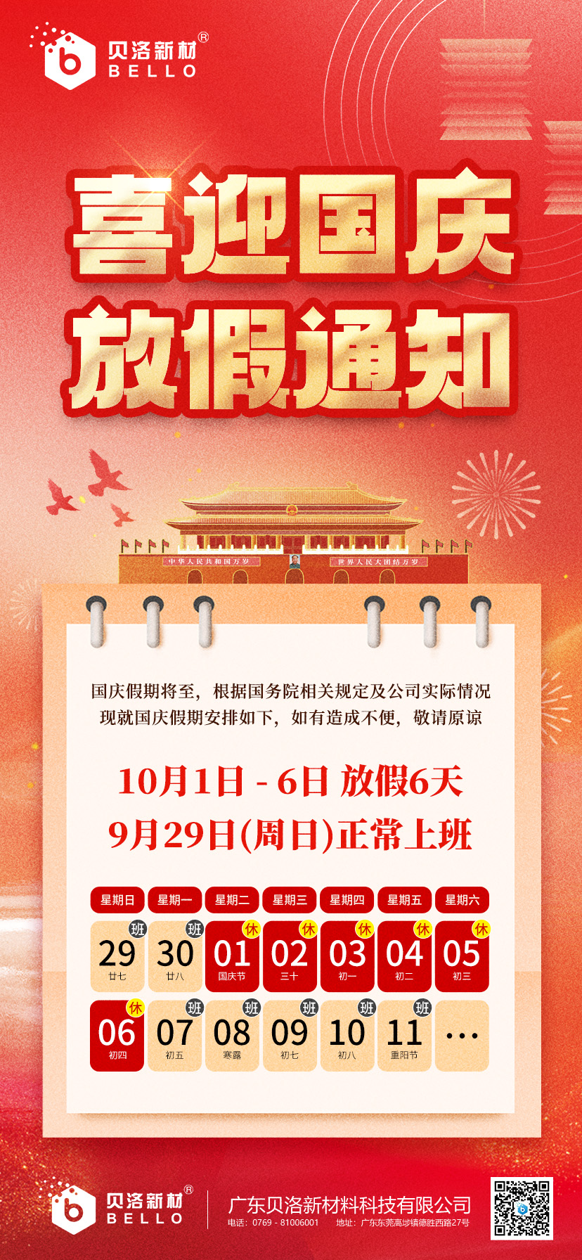 9月29日(周日)正常上班 10月1日-6日 放假6天