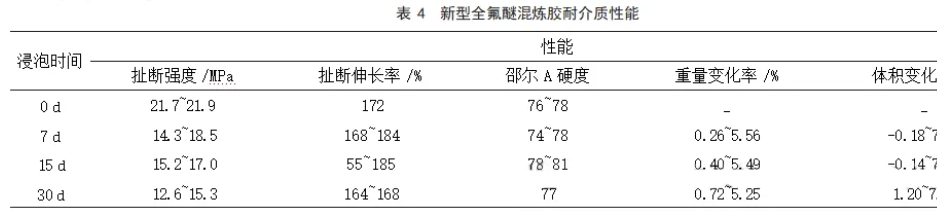 表3顯示,新研制的FFKM混煉膠在常溫拉伸強度與斷裂伸長率上優于其他混煉膠,表明其力學性能突出。同時,高溫壓縮永久變形顯著降低,能在280℃下穩定使用,展現出卓越的高溫性能。表4則證實了其優異的耐介質性能,達到一級相容標準。氟橡膠產品