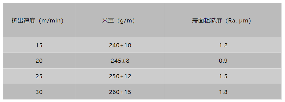 推薦范圍:擠出速度15-30米/分鐘,米重標(biāo)準(zhǔn)差小,粗糙度值(Ra)低。