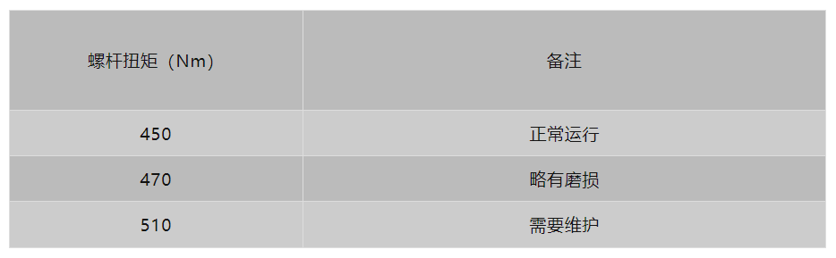 正常/磨損/維護(hù)閾值:450 Nm/470 Nm/510 Nm(需維護(hù)時(shí)>500 Nm)。