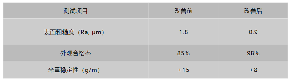 改善前后:表面粗糙度從1.8 μm降至0.9 μm,外觀合格率從85%提升至98%,米重穩(wěn)定性提高。