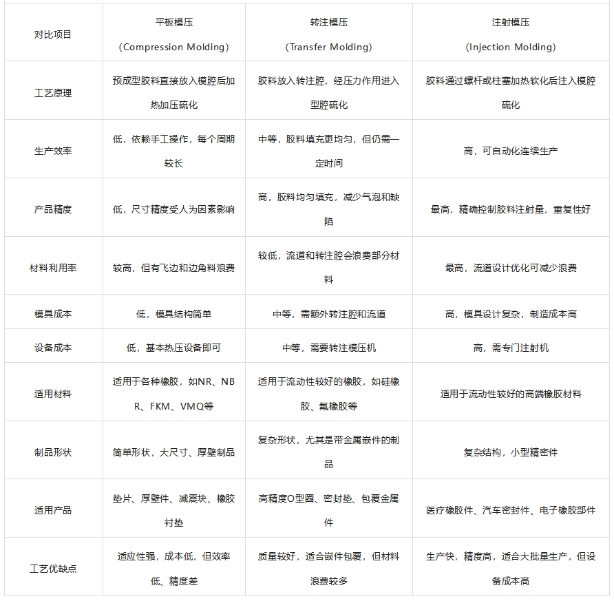 2025-02-25 17:02:01橡膠模壓成型是橡膠制品生產中廣泛應用的工藝,主要包括平板模壓、轉注模壓和注射模壓三種方式。這三種工藝各有優勢和局限性,適用于不同類型的橡膠制品。本文將從成型原理、工藝特點、優缺點及適用產品等方面進行詳細探討。硅橡膠密封圈廠家