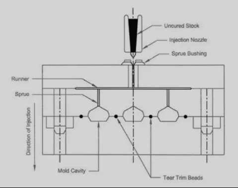 在高溫高壓下,橡膠通過流道系統進入型腔。