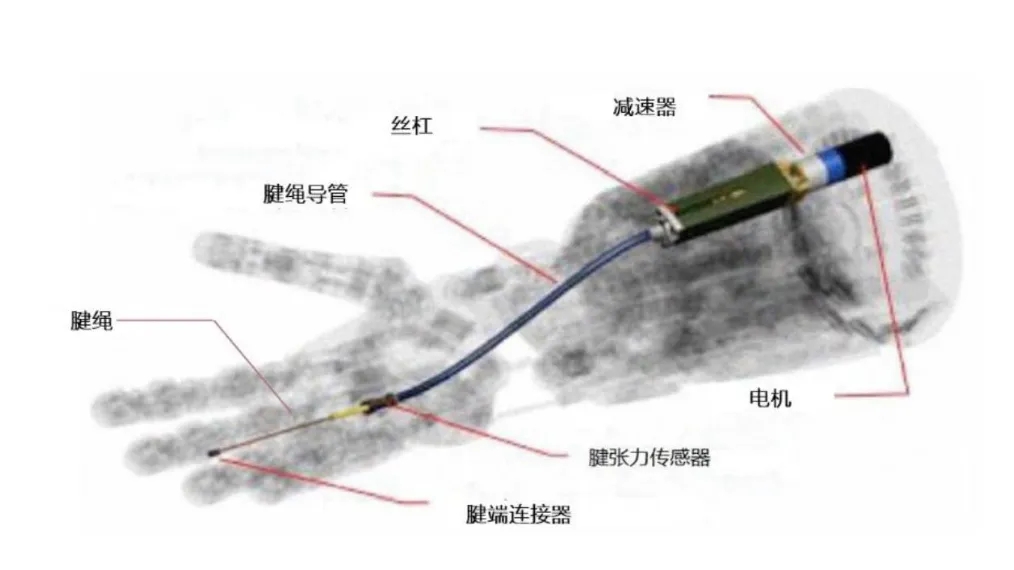 特斯拉人形機(jī)器人第三代靈巧手模型采用“線性執(zhí)行器模塊+腱繩模塊”,線性執(zhí)行器從Gen 2的手掌轉(zhuǎn)移到Gen 3的手臂,使手掌體積更小。腱繩傳動系統(tǒng)的工作原理如下圖所示。
